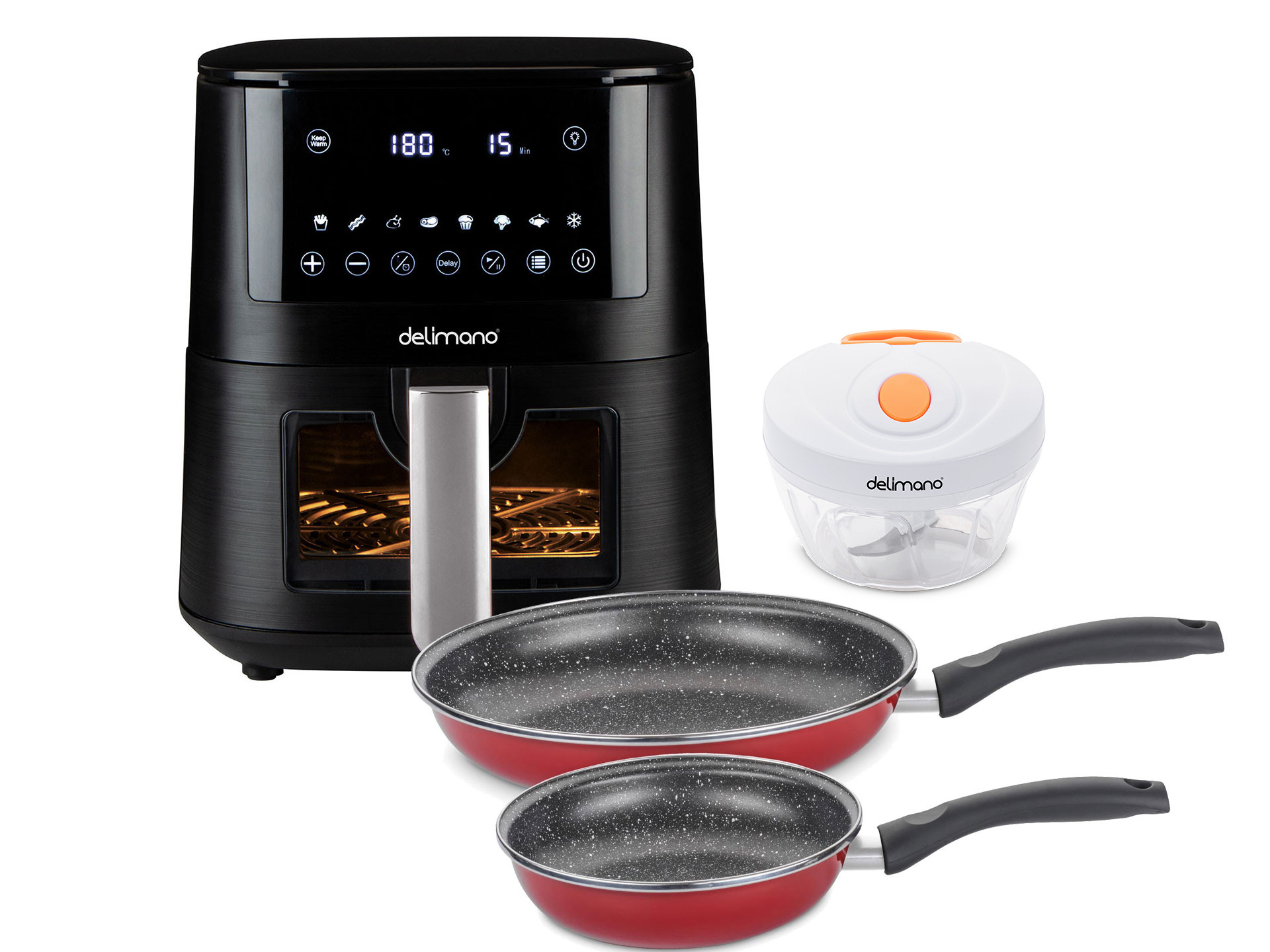 Air Fryer Prime Апаратот за готвење ви овозможува да приготвувате голем број на јадења без масло. Нашите Delimano Stone Legend Classic Таво за пржење се дизајнирана да готват рамномерно и да изгледаат фантастично во вашата кујна. Со Brava Chop Express сечкото можете да сечкате зеленчук, овошје, јатки или чоколадо.