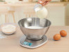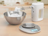 Вагата и садот се направени од не'рѓосувачки челик. Нејзините прецизни сензори ќе ви понудат точни резултати секој пат, а можете да мерите до тежина од 5кг. И не само тежина, можете да мерите и волумен, односно, вода и млеко. Садот собира до 1,8Л и се вади од вагата. Ова значи, дека можете да го користите посебно, како сад за мешање. Работи на батерии.