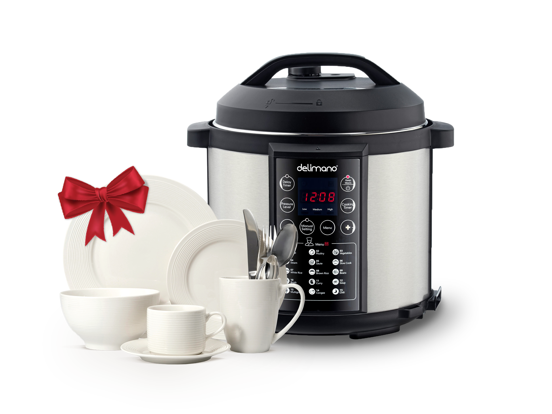 Со Delimano Electric Pressure Мултикукер ќе готвите побрзо, со помала потрошувачка на енергија и повеќе витамини и минерали зачувани во храната. Додадете елеганција и стил на секоја маса со трпезарискиот сет Delimano Essence од 40 парчиња. Совршен за секојдневна употреба, но доволно елегантен за посебни пригоди, овој сет нуди сè што ви е потребно за да послужите 4 лица.